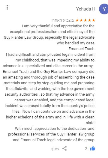 I am very thankful and appreciative for the exceptional professionalism and efficiency...I had a difficult and complicated legal incident from my childhood, that was impeding my ability to advance in a specialized and elite career in the army...an amazing and thorough job...the complicated legal incident was erased totally from the country's police files...Now I can continue on and advance in the higher echelons of the army and in life with a clean slate. With much appreciation to the dedication and professional services of the Guy Flanter law group
