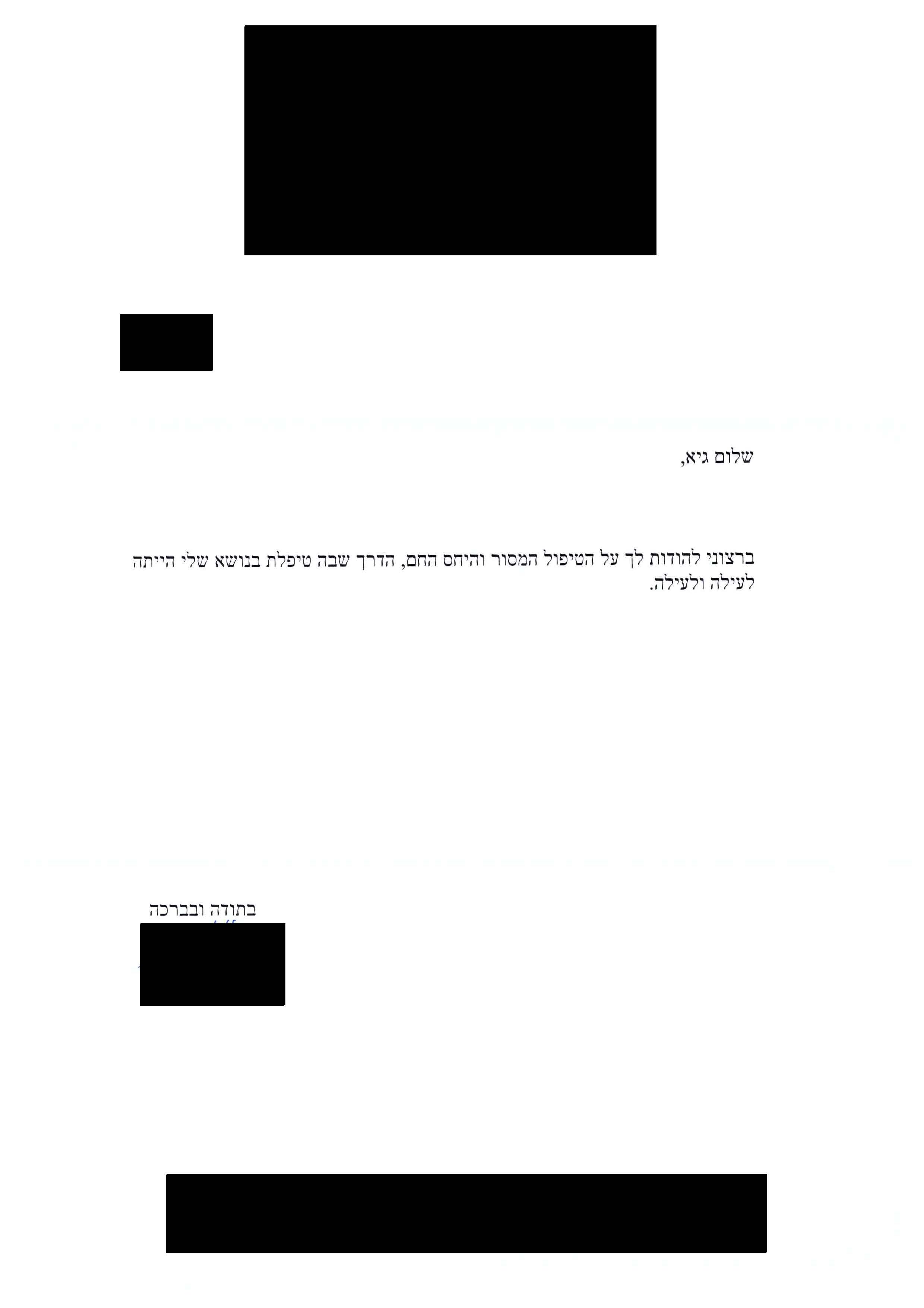 "...אין לי מילים להביע את הערכתי ותודתי על התגובה המפורטת, האנושית - מקצועית בענין בני...המענה המידי והענייני המרגיע, היה בדיוק הדבר שהיינו זקוקים לו...הייתם יותר ממלאך מושיע והשריתם בטחון עלי ועל המשפחה...".