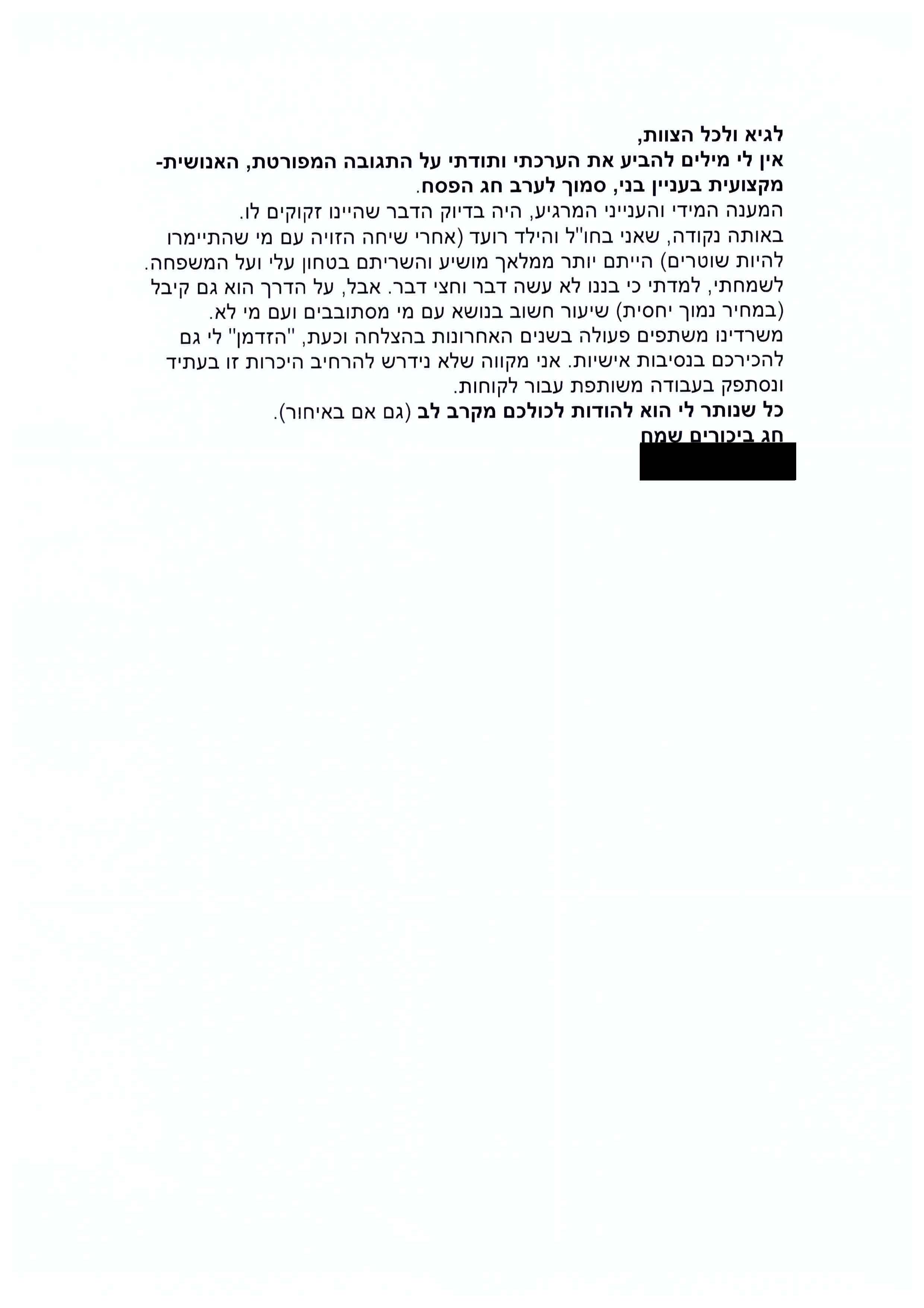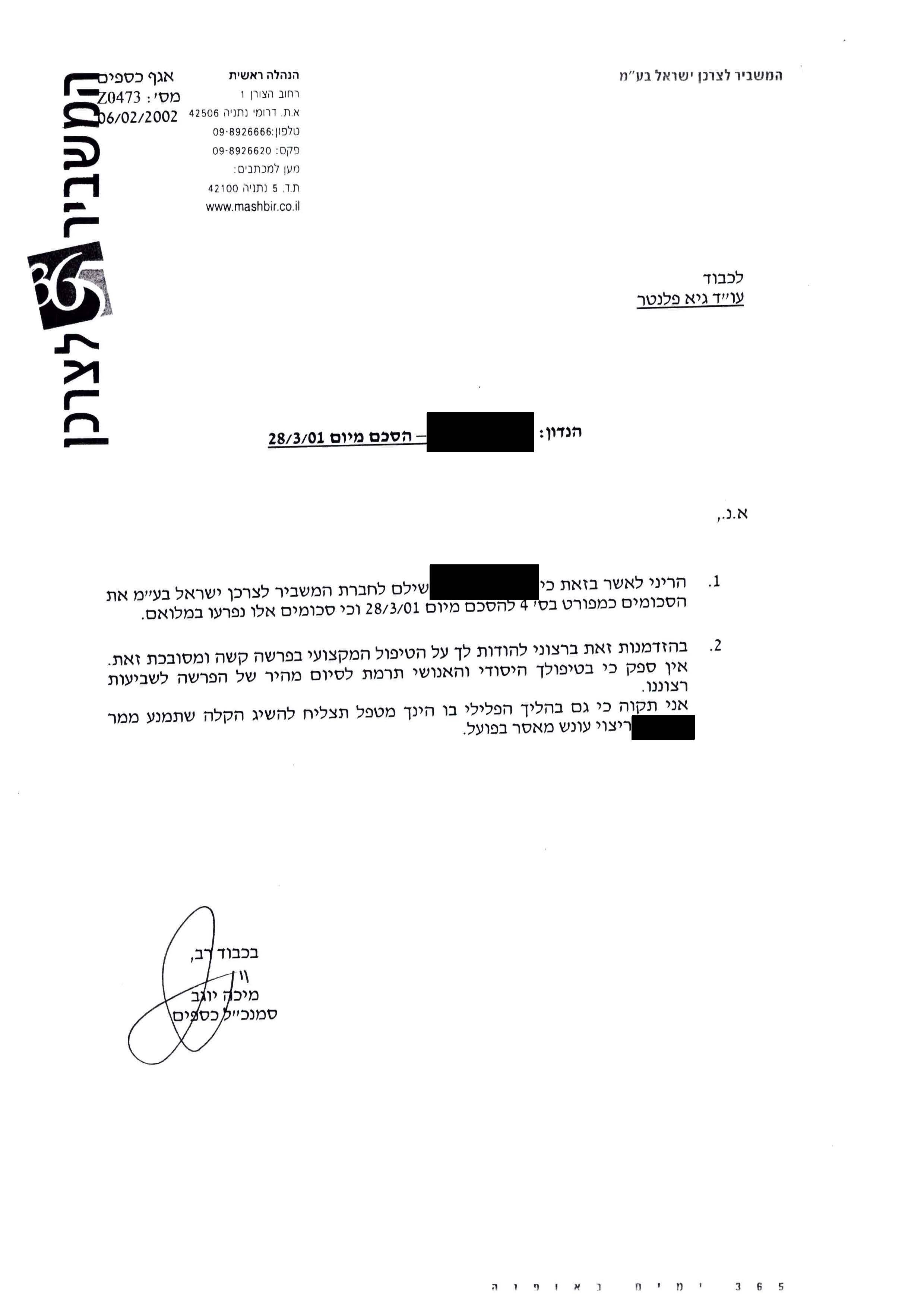 "...ברצוני להודות לך על הטיפול המקצועי בפרשה קשה ומסובכת זאת. אין ספק כי בטיפולך היסודי והאנושי תרמת לסיום מהיר של הפרשה לשביעות רצוננו...".